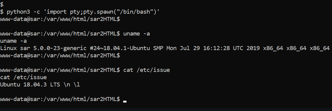 In the previous step, we got the shell access, but it was the limited shell and our target is to take the root access of the target machine. So, I ran another python command which gives us the stable shell access. After that, we ran another command to enumerate the kernel version and operating system version of the target machine. This can be seen in the screenshot given below: