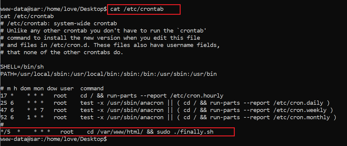 While checking for weak file permissions and processes, we found that there was a Cron job which was being run as a root user every 5 minutes. It can be seen in the screenshot below: