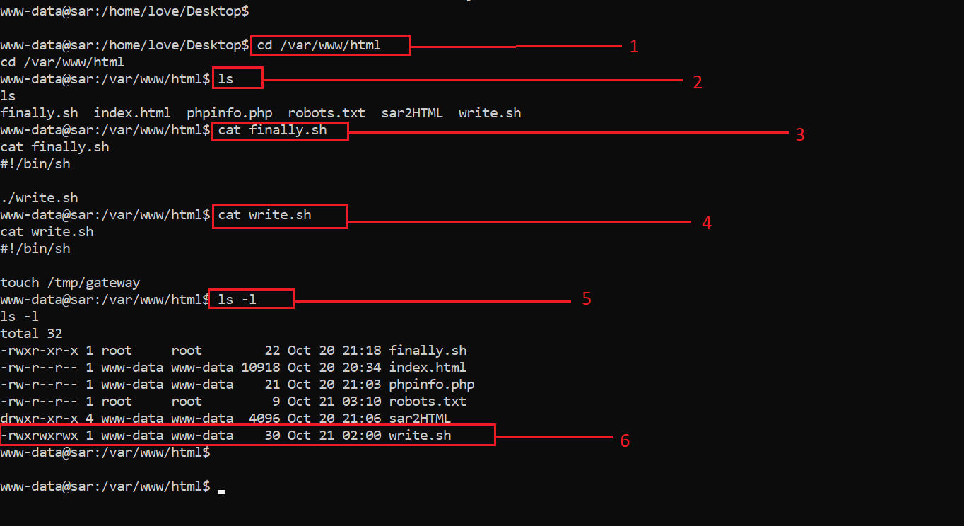- This command was used to list the files with permission, and we have found that we can edit the write.sh file, as it has full permissions on the server. It is being called by the Cron and the Cron was running as root user. << ls -l >>