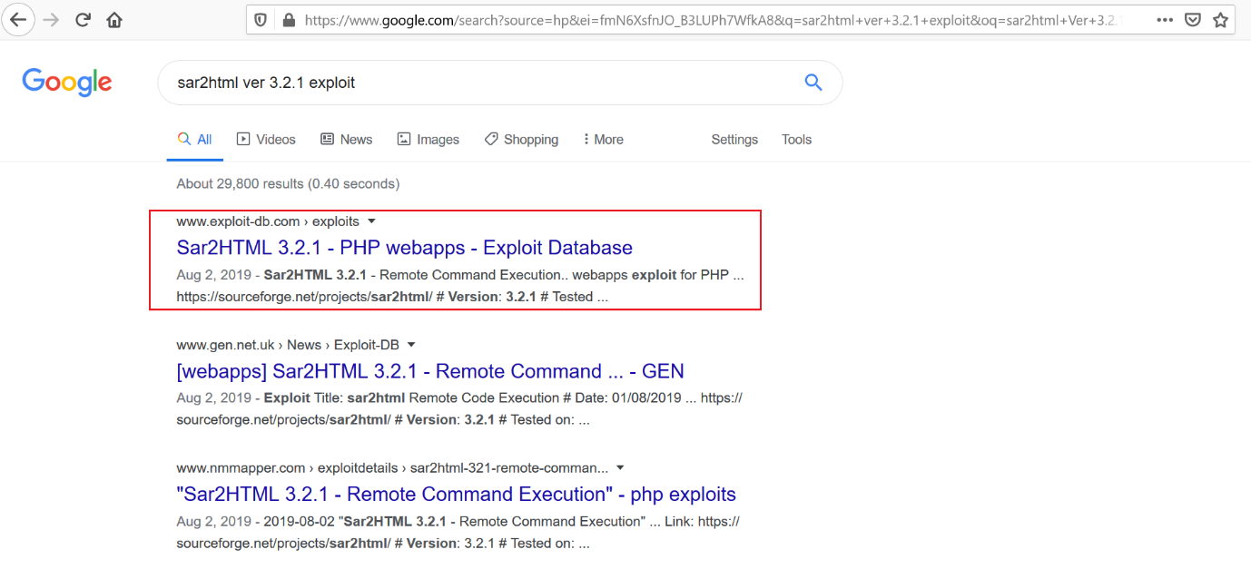 From the previous step, we got to know that our target application is the sar2HTML application and the version of that application is also visible. So I quickly ran a Google search to try to find an available exploit for it. The results of the Google search can be seen in the following screenshot: