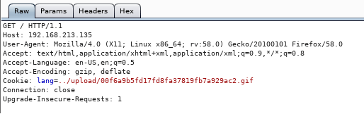- Intercepting the request via Burp, let's insert the uploaded path inside the LANG parameter as shown below: