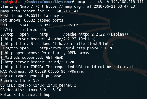 5. As you can see from the scan, we have port 80 open, while port 22 is filtered. This is something we need to remember. It also looks like there is s Squid proxy present on the box.