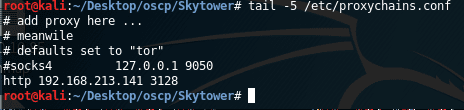 11. But wait! Per the nmap scan, port 22 is filtered out. Let’s setup a proxychains config to redirect the traffic through the SQUID proxy. Below is the configuration in the proxychains file.