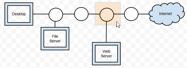 - A) Between the desktops and the Internet, with a separate "DMZ" segment for the file server (The web server would be directly connected to the internet)