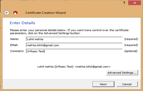 If the passphrase is accepted and all the required details are entered, a key pair is created. A 40 digit fingerprint is generated. OpenPGP is displayed. This fingerprint identifies the certificate as well as the user.