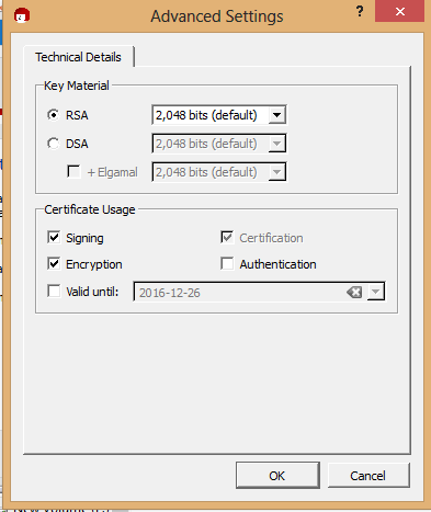 Click on advanced settings to select the functionality and the key strength. We selected 2048 bit RSA, for signing and encryption.