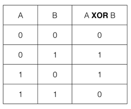 Cryptography uses the exclusive or where A XOR B equals A or B but not both. The image above shows a truth table for XOR. Notice that anything XOR itself is zero, and anything XOR zero is itself.