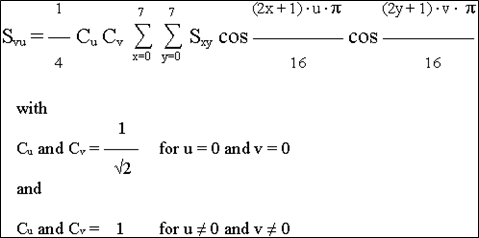 This formula represents the transformation of a Canonical Base belonging to a spatial domain in a corresponding 8x8 block belonging to the frequencies domain. An 8x8 pixel block is more simplistically converted in a frequency spectrum formed only by pixels in black and white. The areas represented by a greater density of white pixels are those with higher frequencies that are not perceptible by the human eye, and are therefore expendable. It's with elimination of these areas that the compression algorithm is so efficient.