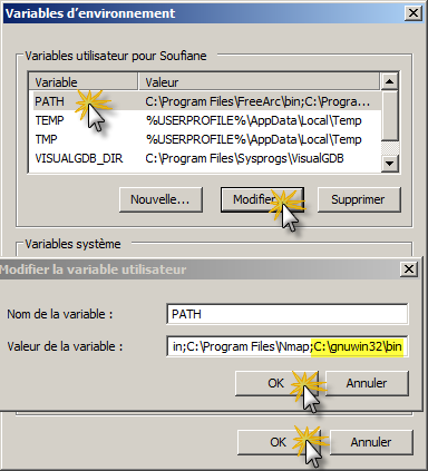In the System Properties window click on "Environment Variables" button, in the Environment Variables window (as shown below), select "Path " variable in the Systems Variable section and click the Edit button. Modify the path line by adding ";c:gnuwin32"