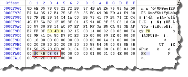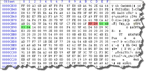 If you are habituated to reverse engineering you can easily see that this is in fact the header of a normal PKZip file, even if you are not, a quick Google search will reveal it. Let's now study the binary data that appends after the end of the image marker.