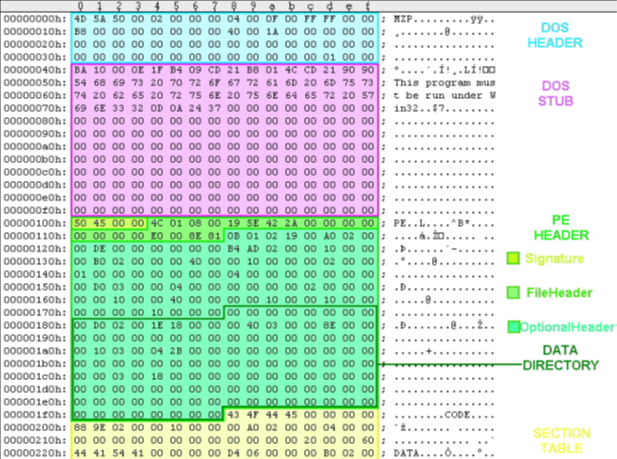 So, to get a data directory, we first need to know about sections, which are described next. An example of how to locate data directories immediately follows this discussion. We can see the various sections and headers in the following image, which is from a hex editor.