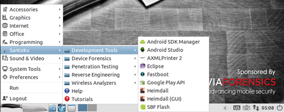 Navigate to "Santoku->Development Tools" and Click "Android SDK Manager". This looks as shown below.