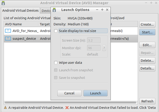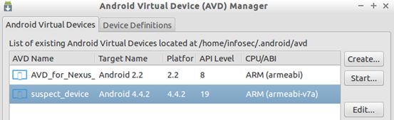 Once you are done with all the steps, open up your "Android Virtual Device Manager", where we created our emulator named "suspect_device" and start the modified emulator by clicking "Start" button.