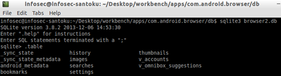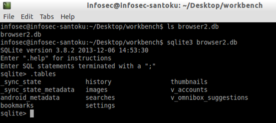 The above command fetched our required "browser2.db" file. Once again, we can use "sqlite3" command line tool to connect to the database file as shown below.
