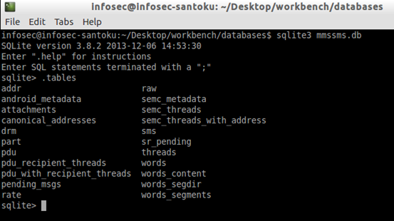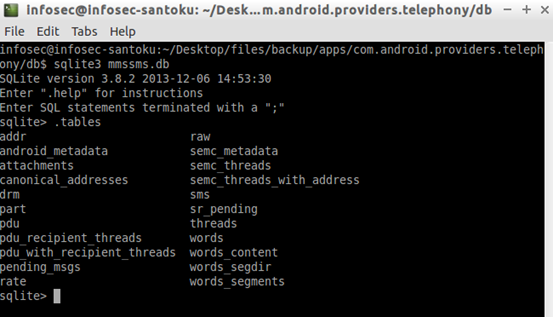 Let's open mmssms.db file using "SQLite3" command line tool as shown below.