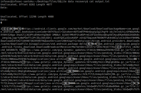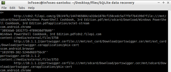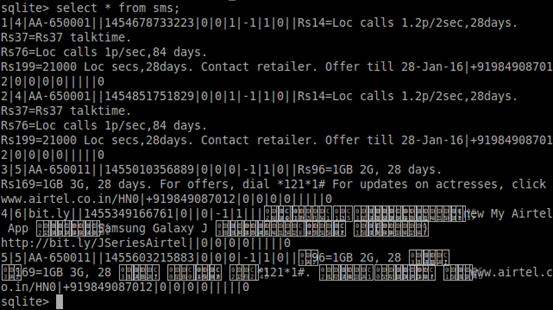 Another interesting yet easy way to recover data from SQLite databases is running strings command on the database file. This will show all the data from the database in a clear manner as shown below.