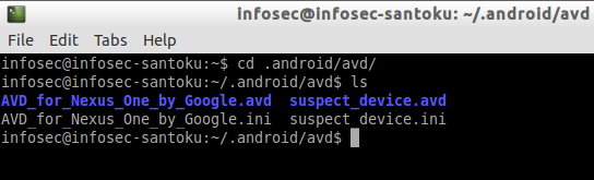 Once you create an emulator, navigate to its location on your file system. In Santoku, following is the location for all the AVDs created.