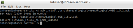 Note: If we install an app that is already installed on the target device/emulator, adb throws a failure error as shown below. The existing app has to be deleted before we proceed to install the app again.