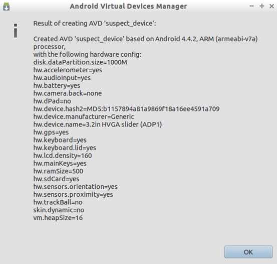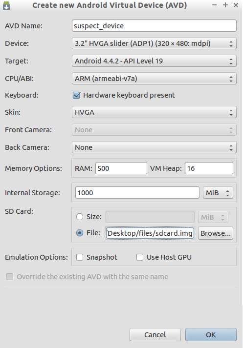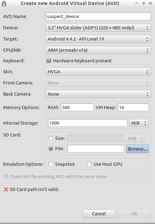 As you can see in the above figure, we have named our emulator "suspect_device." Then, we chose a device with "3.2-inch HVGA" to have an emulator with the smaller size. Then, we chose to have "Android 4.4.2-API Level 19" as our target. CPU is chosen as ARM. Internal Storage is 1000 MB. Finally, we need to provide SD Card options.