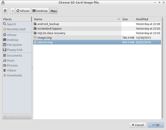 In the case, we are going to choose an SD Card image taken from a real Android device. The image is provided in the VM at the following location.