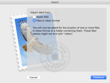 Launch Mail application and navigate to File | Import Mailboxes. We should see the following window. Choose Files in mbox format as we obtained a copy in mbox format.