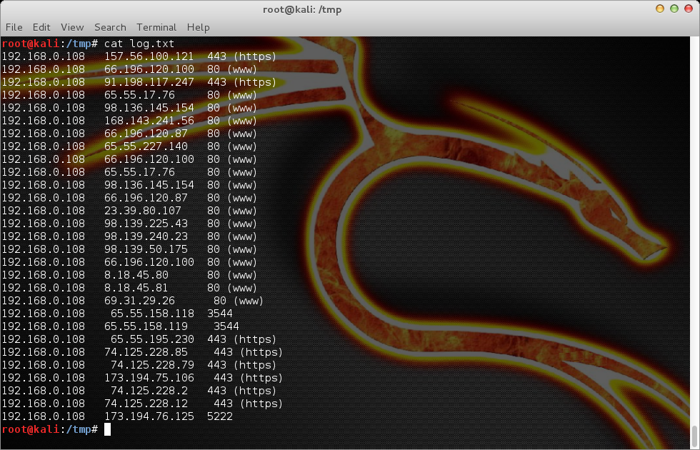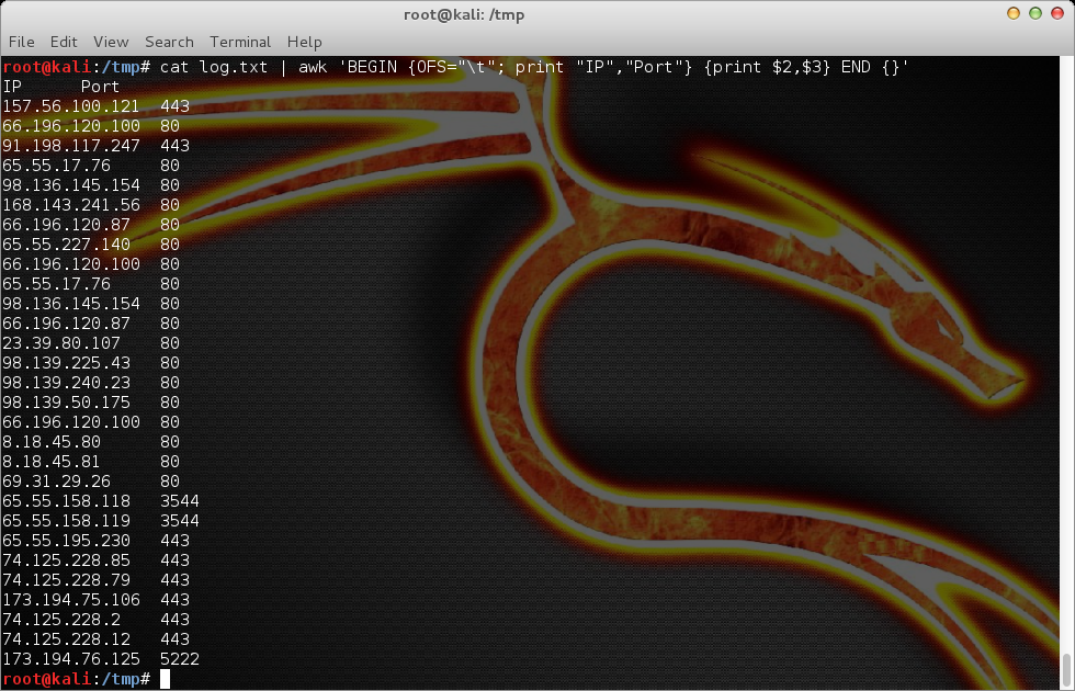 We're going to format these addresses to better suit our needs. For the purposes of this demonstration, we're just going to need the IP address and port of each request. Assuming we store the log file in "log.txt," we can use awk to format the data as we need to: