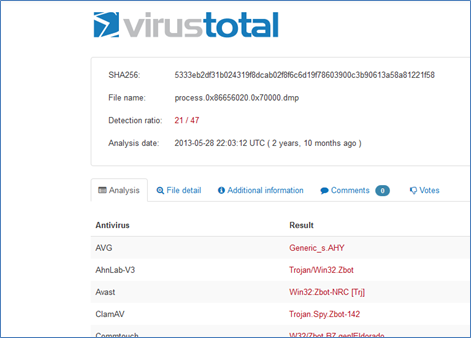 Second issue is for the adfu.exe file, which we already know. Here, we can fetch the file from infected machine and submit it for analysis on VirusTotal (Web application)