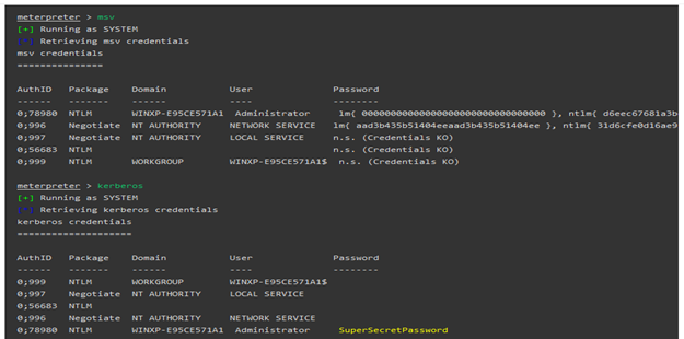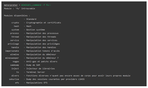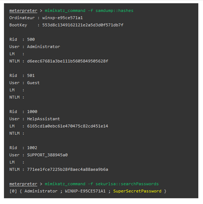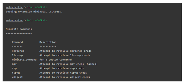 Metasploit already provided some built-in commands that showcase Mimikatz's most interesting features are dumping hashes and clear text credentials straight from memory. However, the "mimikatz_command" option gives us full access to all the features in Mimikatz.