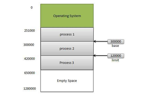 Memory management provides protection by using two registers, a base register, and a limit register. The base register holds the smallest legal, physical memory address and the limit register specifies the size of the range. For example, if the base register holds 300000 and the limit register is 1209000, then the program can legally access all addresses from 300000 through 411999.