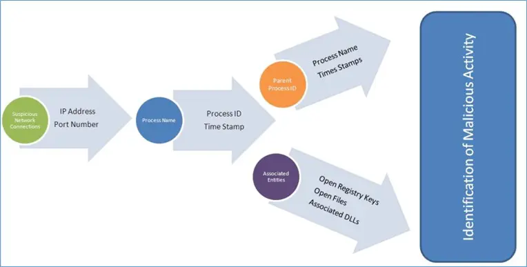 Below is the process where we have started with the identification of a suspicious network connection or activity. Here, one of the connection options from Volatility any active or recently closed network connections can be extracted from RAM. We can use series of WHOIS queries and some research on google docks that can begin to narrow down the network connections. Below mentioned process might need to be repeated many times to reduce the entries on the list further. It should also be noted that the best analysis will come from correlating data from both the RAM capture and artifacts from the hard drive.