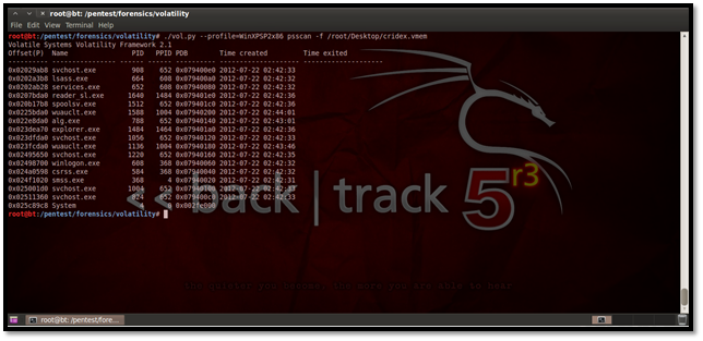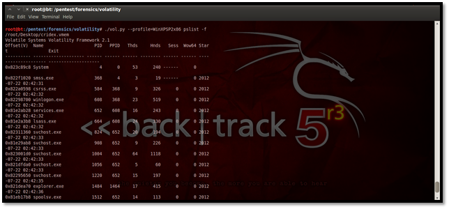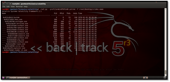 This plug-in may be used for viewing the processes in a tree form. Similar to Pslist, it does not show the hidden processes. Here is how it looks: