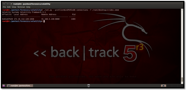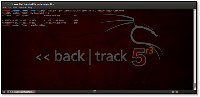 The connscan plug-in helps us to find active connections as well as connections that might have been terminated. Here is how to use it: