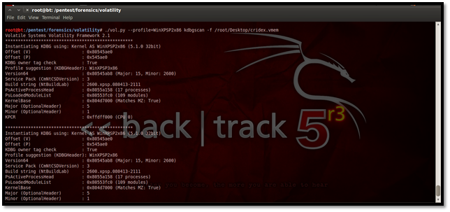 This particular plug-in is designed to positively identify the correct profile of the system and the correct KDBG (kernel debugger block) address. It simply scans for KDBG header signatures linked to the profiles in Volatility. This is mainly helpful in clearing up confusions which might be caused if the Pslist plug-in not showing any processes in the process list. This may happen if a KDBG with an invalid PsActiveProcessHead pointer is found earlier in a sample.