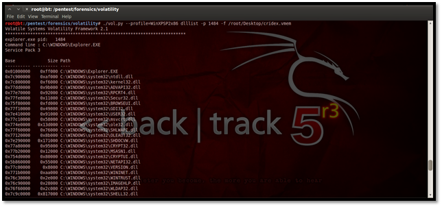 For listing the DLLs for a specific process, suppose we list here the DLLs of explorer.exe, which has the process id 1484. The process id may be found using the pslist plug-in.