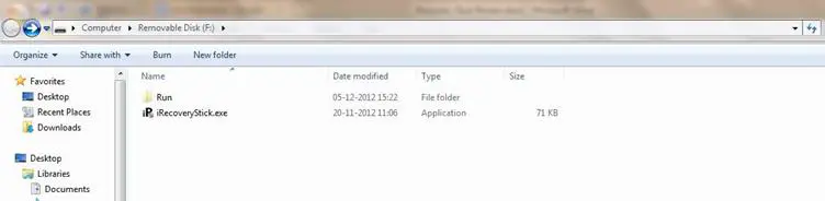 The iRecovery Stick shipment box contains the iRecovery Stick and a USB cable that is compatible with the iPhone 3GS, 4 & 4S.The iRecovery Stick is compatible with Windows XP and 7, and provides an easy-to-use user interface. The iRecovery Stick does not support vmware/virtualbox environment and Linux &Mac OS X operating systems. Also, it is mandatory to turn off the antivirus software running on the Windows OS for better data recovery. The iRecovery Stick is a portable and simple-to-use USB flash drive which contains the recovery software iRecoveryStick.exe. Recovery software included in the iRecovery Stick can be installed on to the hard drive or it can be executed directly from the USB drive. The image below displays the contents of the iRecovery Stick USB drive.
