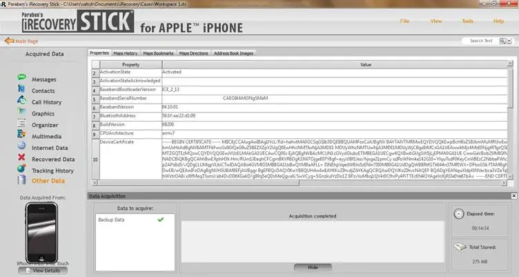 The recovery process acquires existing data and recovers deleted data from the iPhone, but the majority of the data will be the normal user's data which has never been deleted. Once the recovery process is completed, then it immediately displays all the data recovered from the iPhone (shown in the image below). The recovery process downloads the existing contents of the phone such as contacts, call history, text messages, calendars, notes, pictures, multimedia and all other data like Safari history, Safari bookmarks, GPS history and application cookies. It also recovers different types of deleted data including text messages, contacts, call history, and calendar entries. The iRecovery Stick is not capable of carving the file system, so it can only recover the deleted data from the Sqlite database files and does not recover the deleted files from the file system, i.e. it does not recover deleted photos.