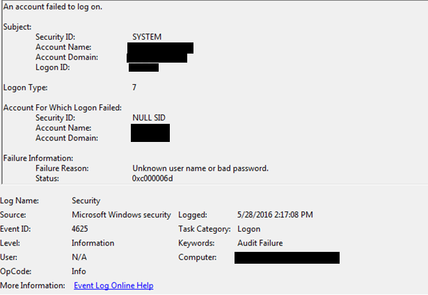 - This screenshot shows an account failed to login (EventId 4625), and LoginType is 7 which means unlocking the screen is not successful.