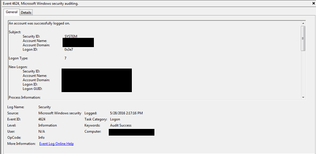 - Below screenshot shows an account failed to login (EventId 4624), and LoginType is 7 which means unlocking the screen is successful.