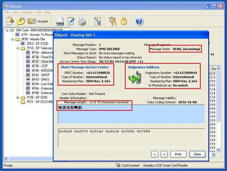 As can be seen in above figure, by using the SIMpull application we can see the information of SMS such as a SMS text and its length, the SMS sender's number information, service center information, etc.