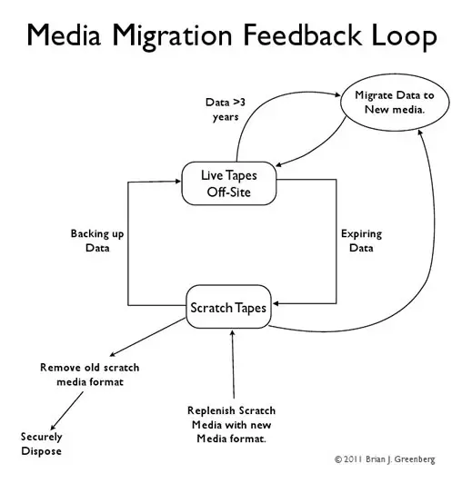 A solution to the problem of legacy systems and data storage also solves problems associated with encryption key management. While it's fairly simple to do and set up the policies, it does, however, take a disciplined team to employ the practice and should be automated through and through whenever possible. One way of viewing a data lifecycle management process is illustrated in the following media migration feedback loop.