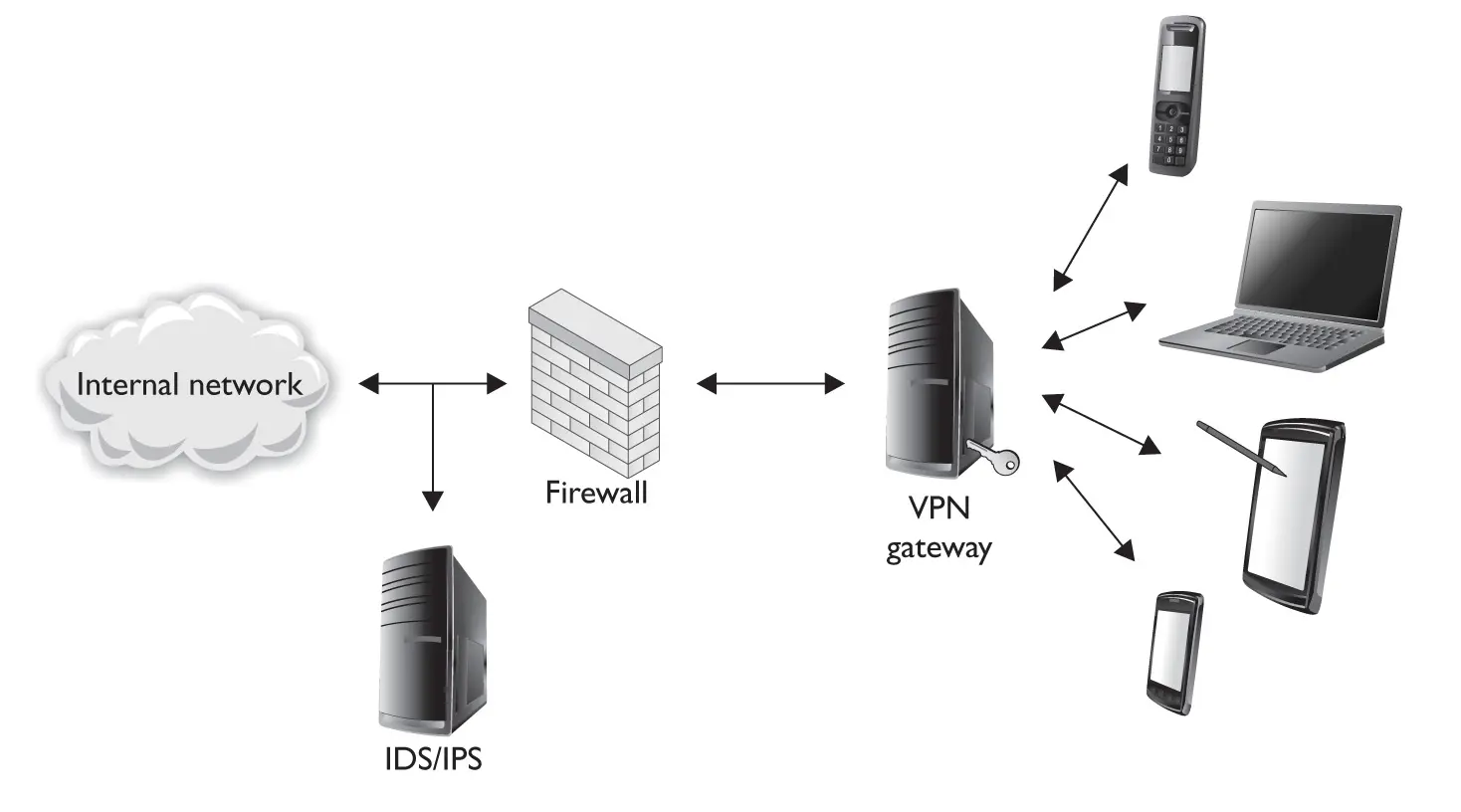 Segmenting remote access traffic is an important step in the design of your infrastructure. Most organizations treat remote access traffic as potentially hostile and do not allow remote access traffic to come directly into the internal network. One approach is to accept remote connections at the VPN/access gateway, decrypt the traffic there, and then pass the traffic through a firewall and IDS/ IPS configuration, as shown in Figure 4-1. This allows for the filtering of remote access traffic (do remote users really need access to port 1433 or 3306?) as well as monitoring of the traffic for suspicious or malicious activity. Although, in theory, anyone making a successful connection to your VPN infrastructure is “legit,” there’s nothing wrong with keeping an eye on their activity, particularly if you’re looking to protect yourself against infected or compromised hosts. Segmentation also gives you a control point to restrict or reject all remote connections if necessary.