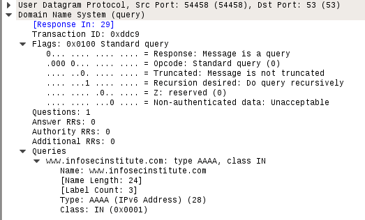 Below is a screenshot for a standard query and response packet in Wireshark. As you can see below is a request for infosecinstitute.com for Records types: Type A and Type AAAA which is simply asking host's ipv4 address and ipv6 address respectively.