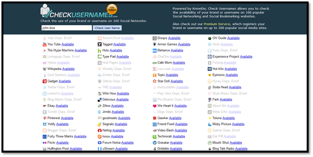 This is actually made to find out if a user wants to use a particular username in a social networking site than whether it is available or not. But we can use the same to check if our target is using other social networking sites or not. It's quite simple you just have to add the target's username and search. The site will search through 160 different social sites and give you the result. Check for the sites are not available, that means the particular username is already registered in the site and may be another account of your victim as shown in image1.