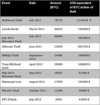 The following table is a list of principal events ordered by amount of stolen Bitcoin extracted from book "Digital Virtual Currency and Bitcoins – The Dark Webs Financial Market – Exchange & Secrets"
