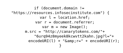 The canary token server can also send a notification if a Web page is copied (and hosted on another top-level domain). This is usually the first step in a well-executed phishing campaign. By clicking the “Create my Canarytoken” button, this snippet of code is presented. You can see our example to the right, using our example website.
